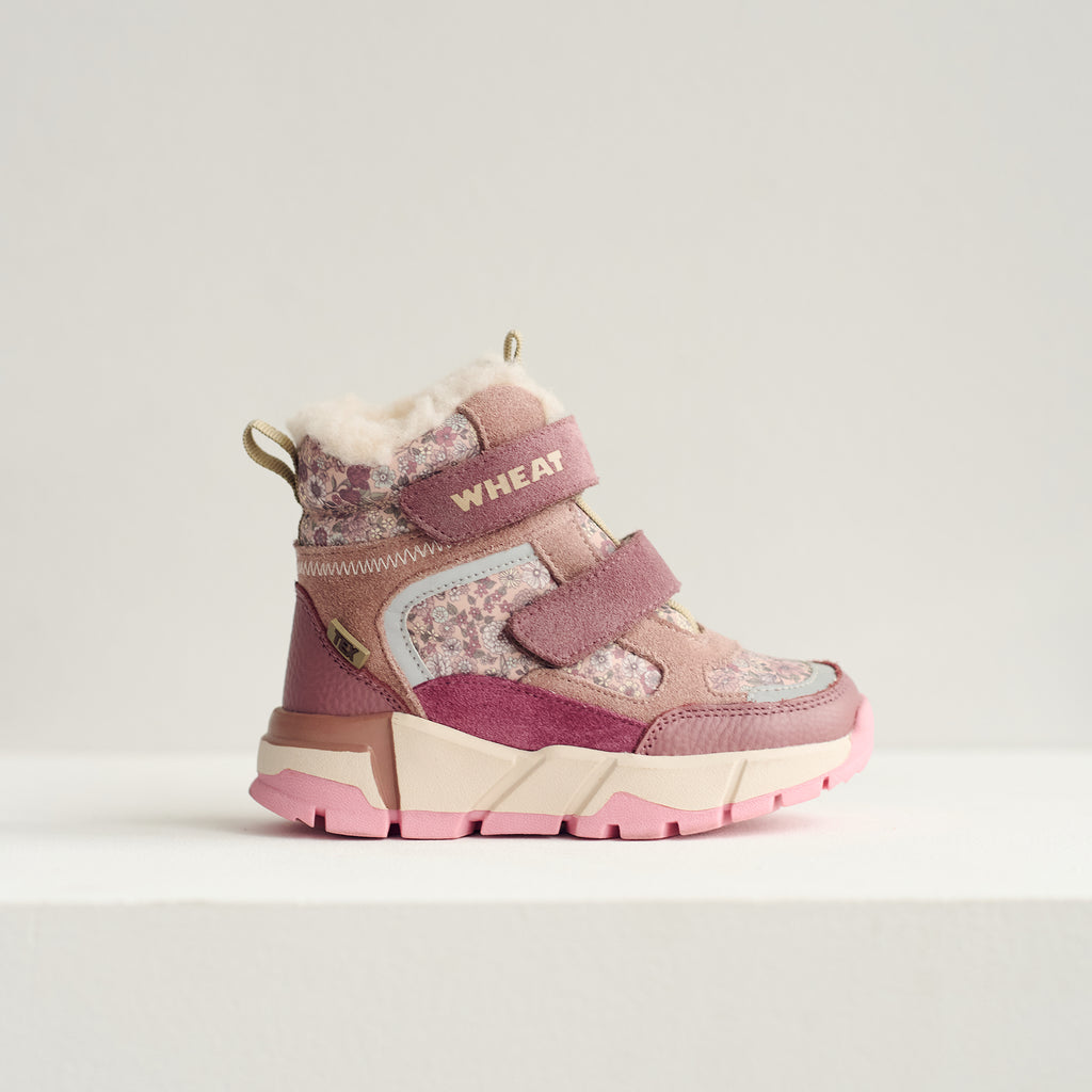 Sporty winter boots with double velcro closure for your child.- Wool lining- Tex membrane - Two velcro straps- Wheat signature printWheat’s winter boots have a comfortable and warm wool lining and are easy for your child to get in with a simple closure. The boots have a Tex membrane that is 100% breathable and waterproof, which is practical for the autumn and winter seasons, as this keeps the little feet both warm and dry. These sporty winter boots have a high shaft and two velcro straps across the foot for easy use and adjustability. The winter boots are made of a combination of LWG certified leather and flower printed nylon.The boots have wool lining, as well as a removable insole that is made of latex and covered with wool, which is why these boots are perfect as winter boots, as they are both supportive and warm. The boots have a rubber outsole with great traction and flexibility. It is normal in size with a firm grip on your child's foot. Recommended allowance for growth: 1-1,5 cmInner measurement:Size 24 = 16,1 cmSize 25 = 16,8 cmSize 26 = 17,5 cmSize 27 = 18,1 cmSize 28 = 18,8 cmSize 29 = 19,4 cmSize 30 = 20,1 cmSize 31 = 20,8 cmSize 32 = 21,4 cmSize 33 = 22,1 cmSize 34 = 22,7 cmSize 35 = 23,4 cm