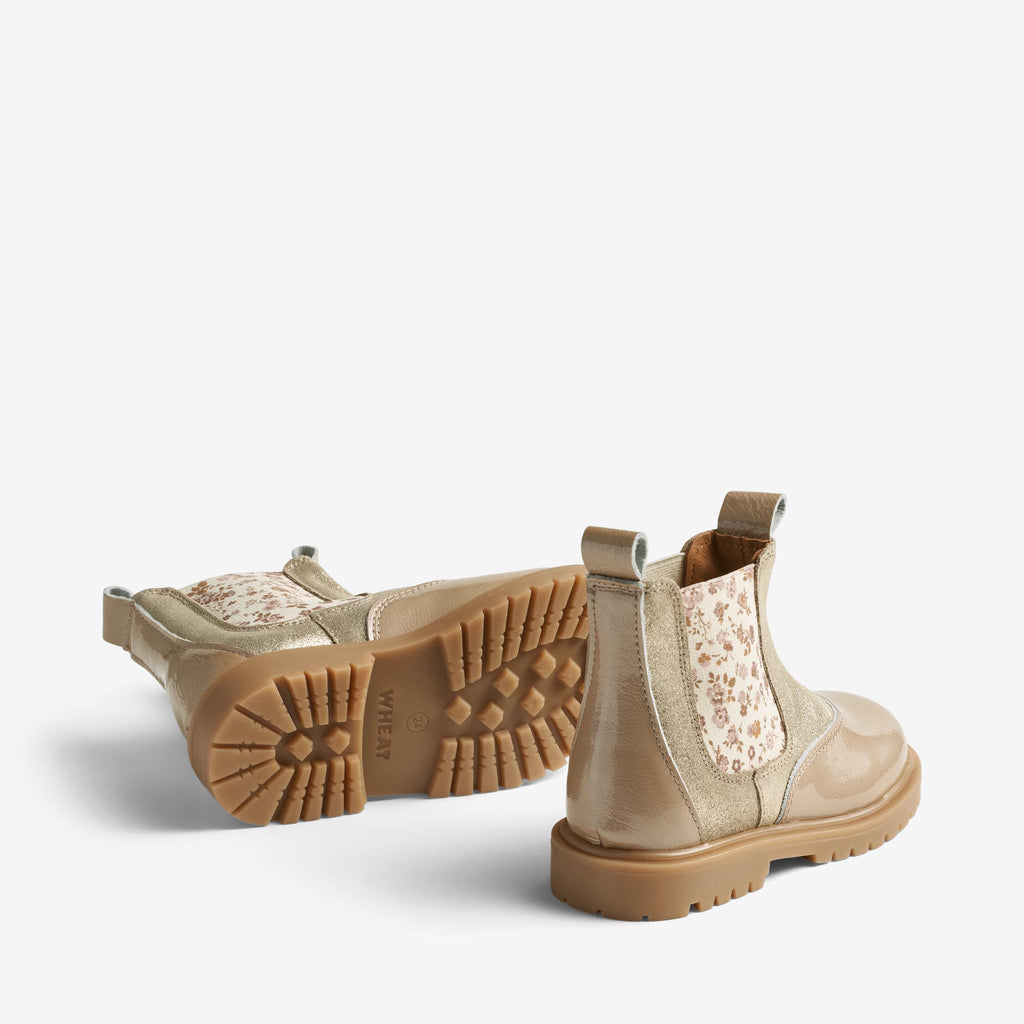 Glitter Chelsea boot made with a mix of patent and leather details for children.