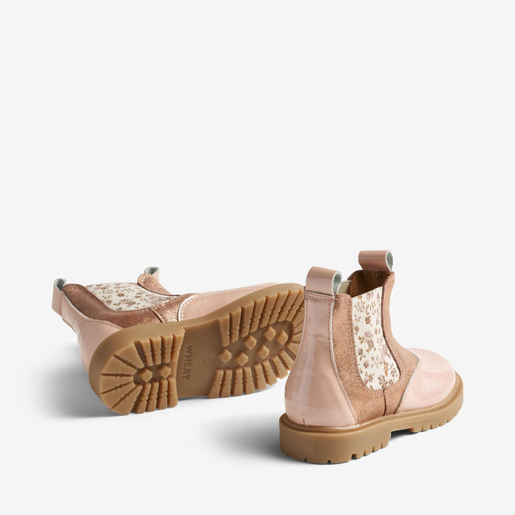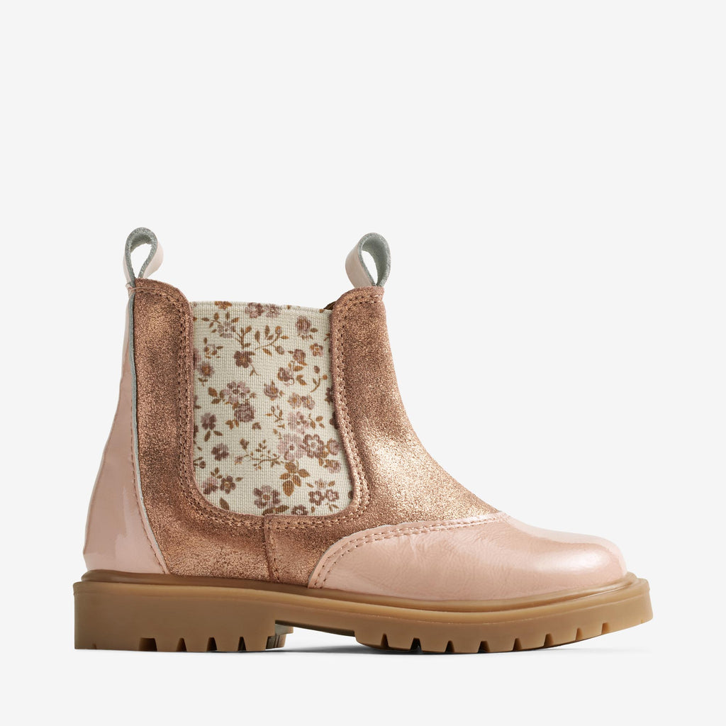 Glitter Chelsea boot made with a mix of patent and leather details for children.