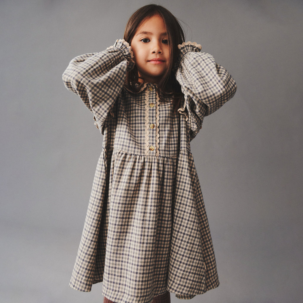 Long-sleeved dress in soft woven organic cotton for children. - Regular/loose A-shape- Length: below knees- Small collar- Frills on shoulders and wrists - Cutlines above the waist with gatherings- Placket at the front with buttons- CheckedA modern dress in soft woven organic cotton – this long-sleeved dress is a true standout piece in any autumn wardrobe. With a silhouette that blends everyday wearability with refined design details, this dress balances heritage-inspired elegance with contemporary cool.