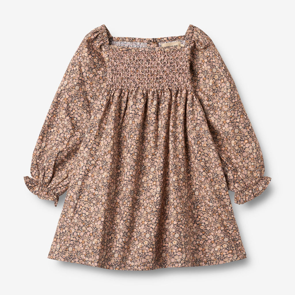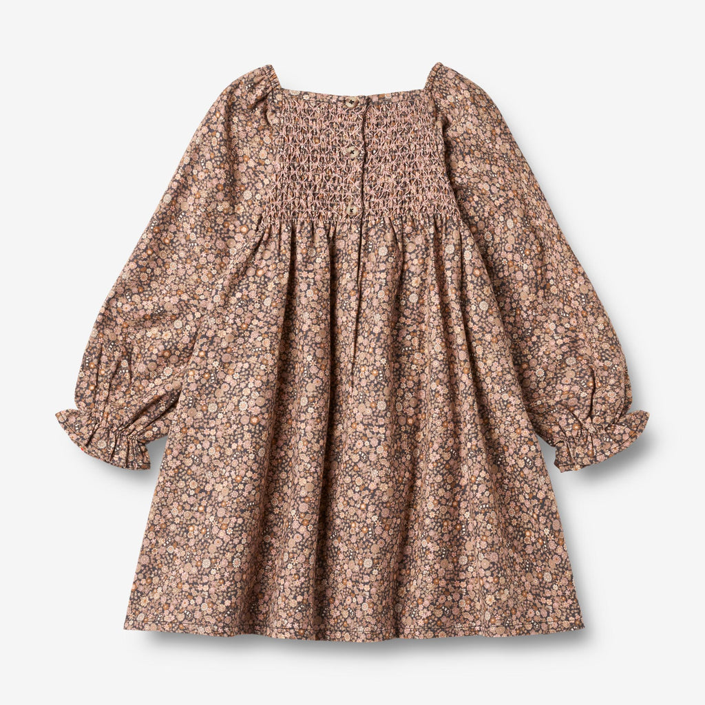 Lovely long-sleeved dress with smock detail made from soft organic cotton for children.- Square neckline- Wide smock panel across the chest- Fitted shape at the smock section- Long puffed sleeves with narrow elastic at the shoulders- Elastic with pleats and volume at the wrists- Cutline at the waist with pleats and a flared skirt- Buttom closure at backWheat's dresses are designed to be comfortable and should be a staple in your child’s wardrobe. They can easily be dressed up or down depending on how you style the outfit.The smock detail ensures a close fit around the upper body, while the gathered waist adds volume to the skirt. All in all, a lovely dress for the many events of the autumn season.