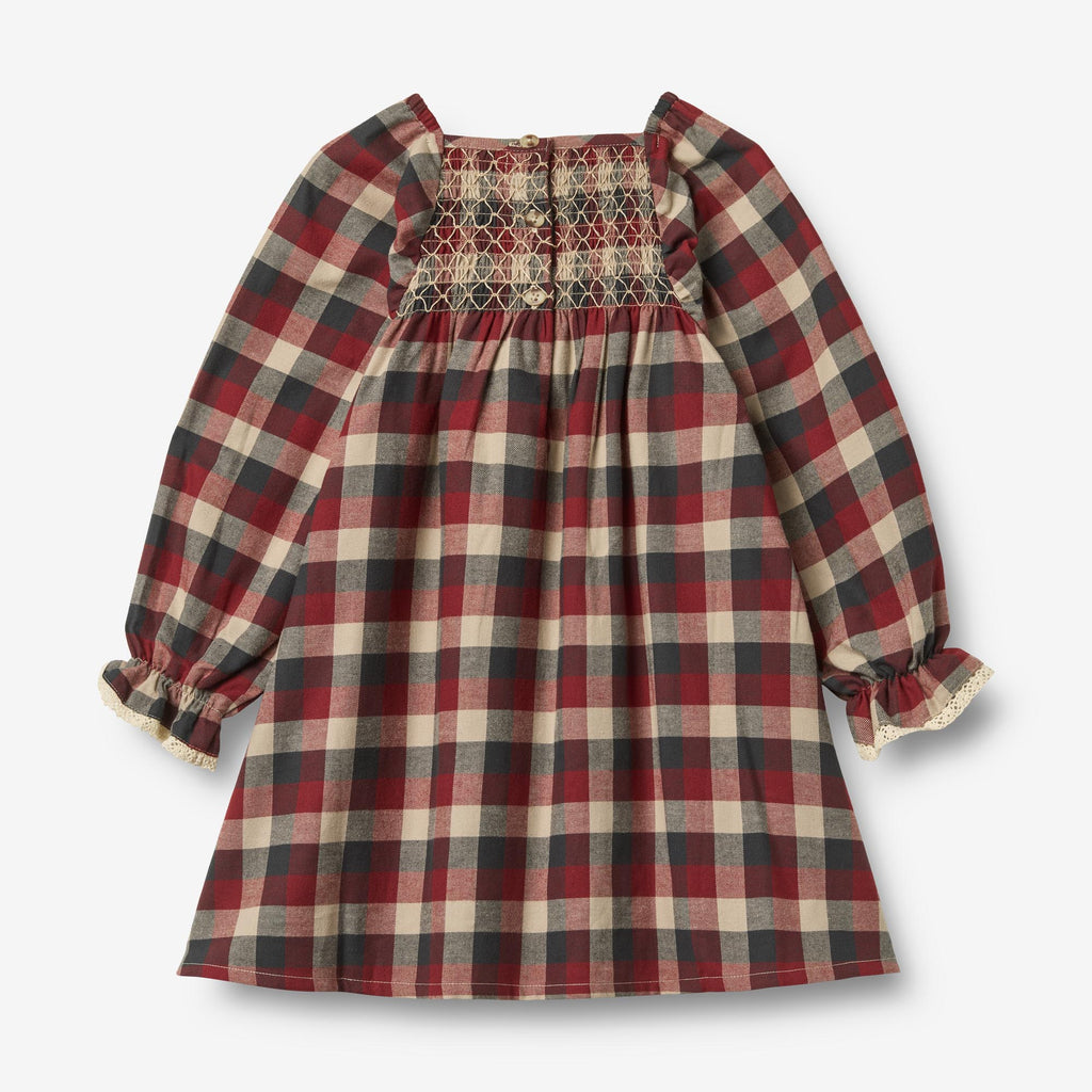 Long-sleeved dress with smock-details at chest in soft organic cotton for children. - Cutline above chest with gatherings below - Smock details at the top part both front and back- Wide unique neckline- Checkered fabric- Balloon sleeves - Buttons at the back- Cute lace details at sleeve cuffs Wheat's sweet dresses have a loose fit, which make them easy and comfortable for your child to wear. The dress has a flattering cutline with gatherings at chest, which gives the dress some lovely volume at the skirt. The dress is easy to style with tights and a knit on the colder days.