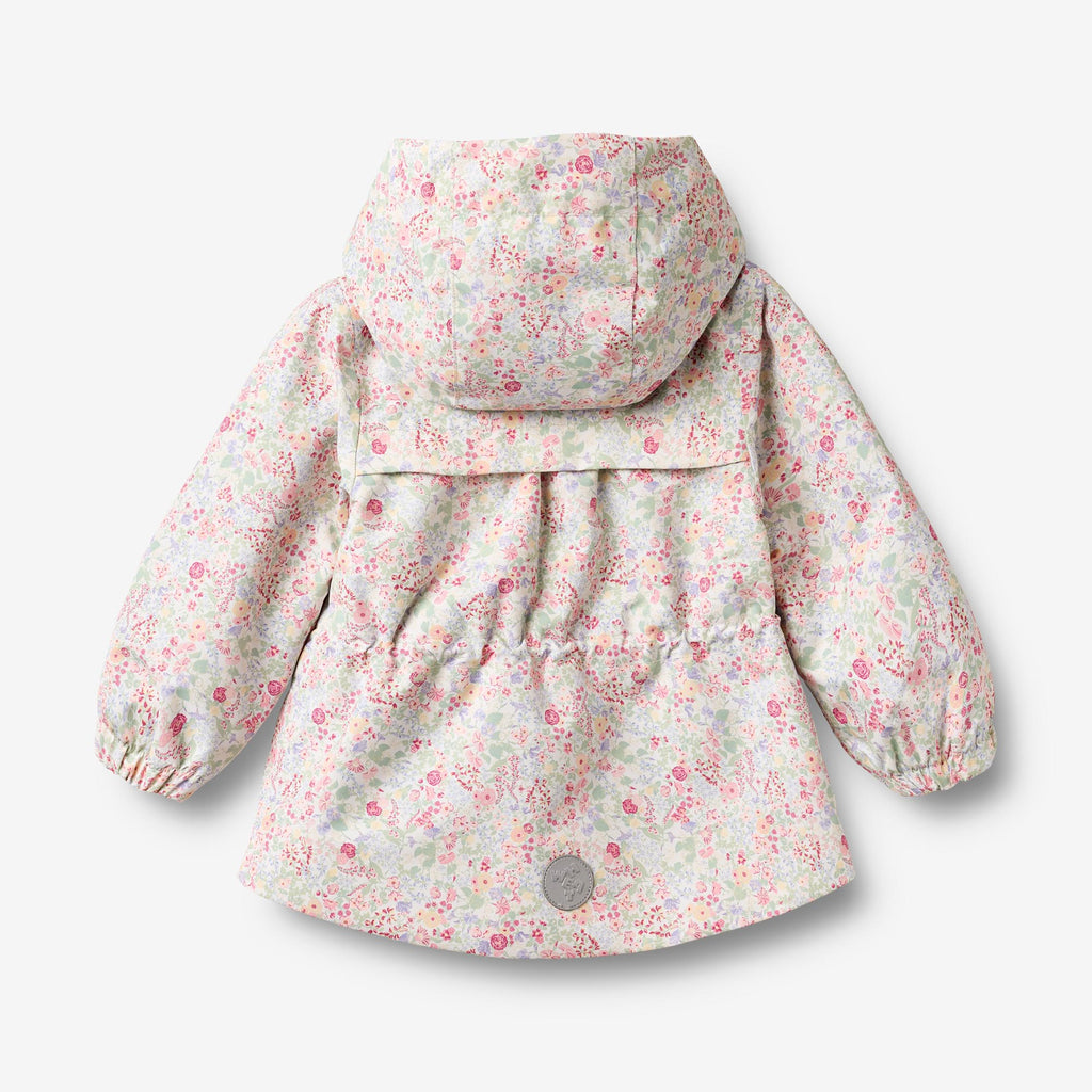 A-shaped technical jacket with print in waterproof and breathable fabric for babies.