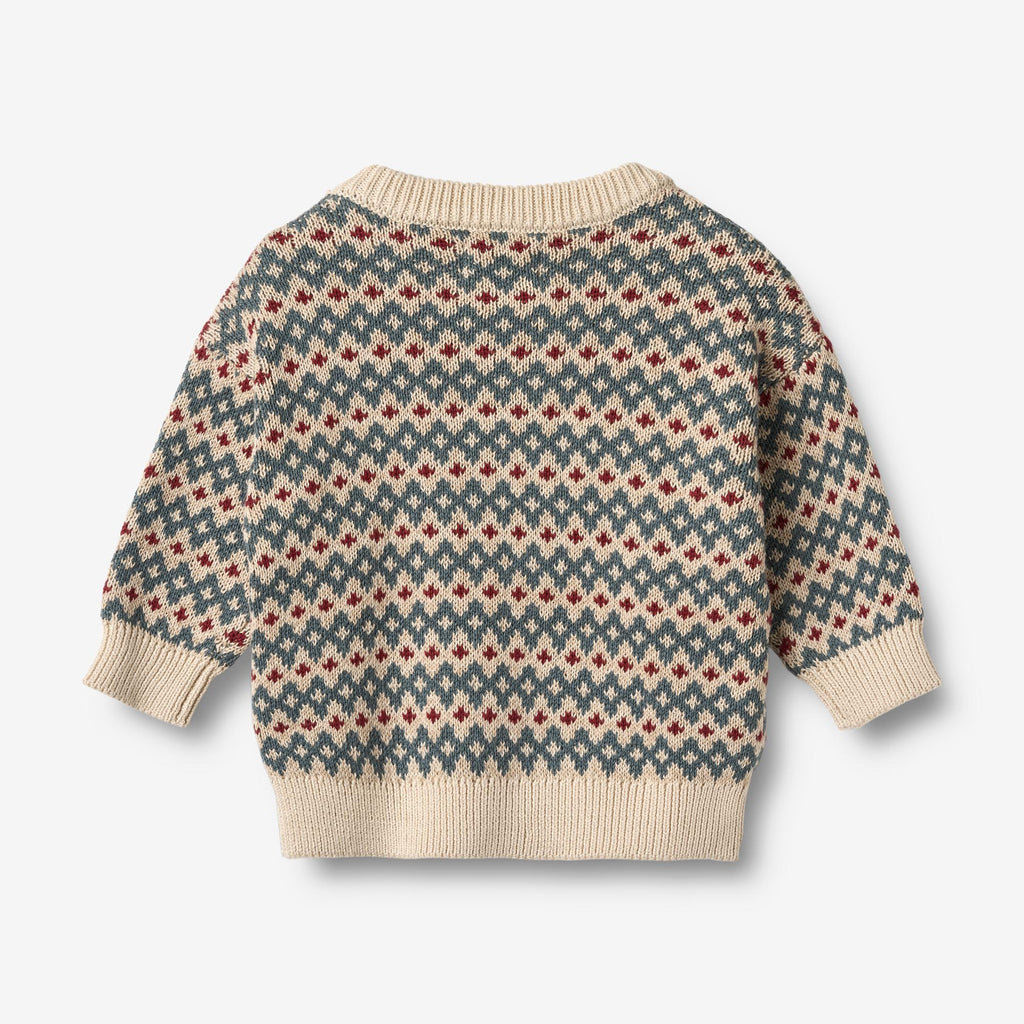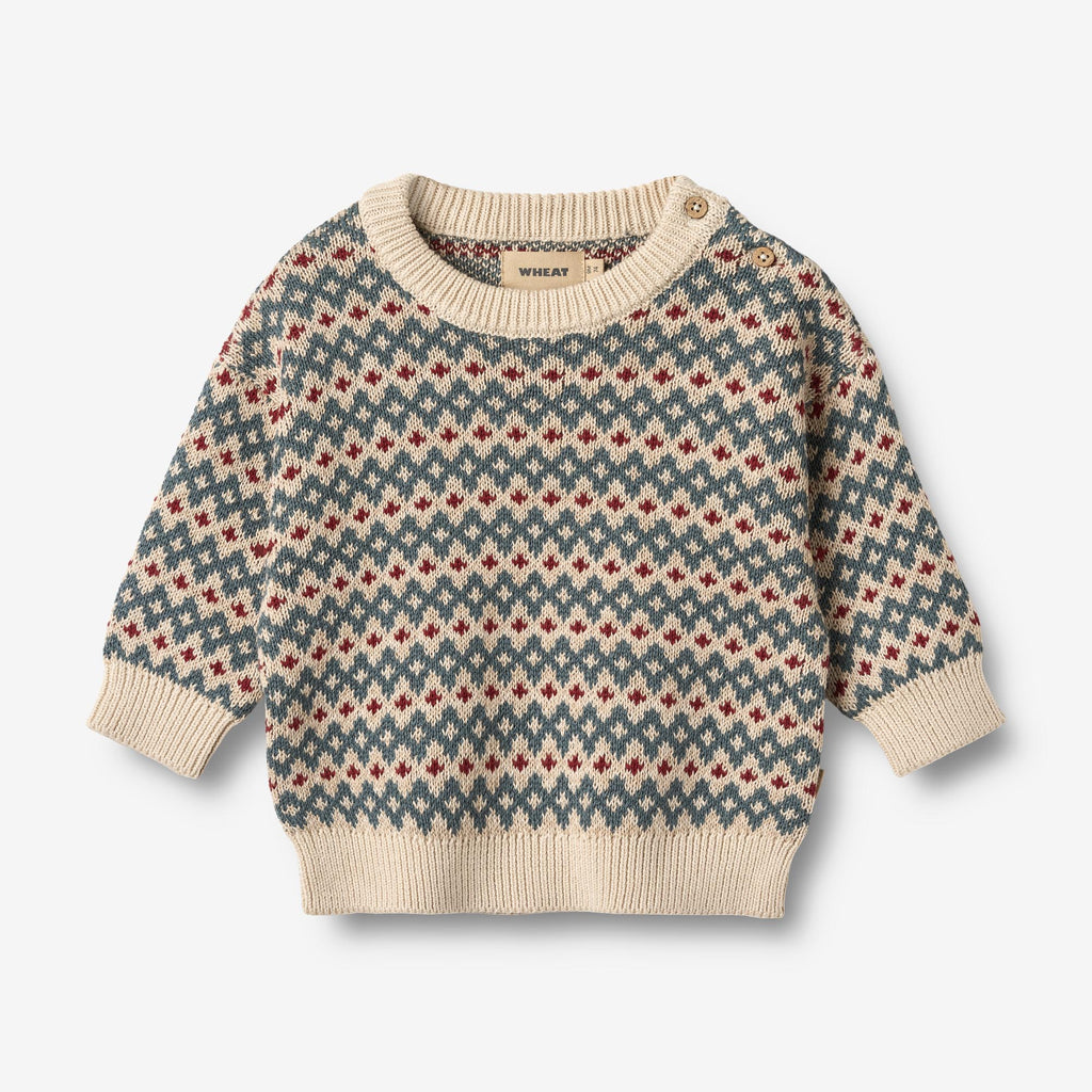 Long-sleeved knit pullover with pattern in soft organic cotton for your baby. - Regular/loose fit- Dropped shoulders- Rib at the neckline and hems- Button opening at left shoulder- Unique knit patternWheat's knitwear is a true essential during the cold autumn and winter months, as it is soft and comfortable for your baby to wear without any kind of itchiness. Our knits have a classic look with a relaxed fit that makes it easy to style with a pair of trousers or over a dress depending on the weather and occasion.