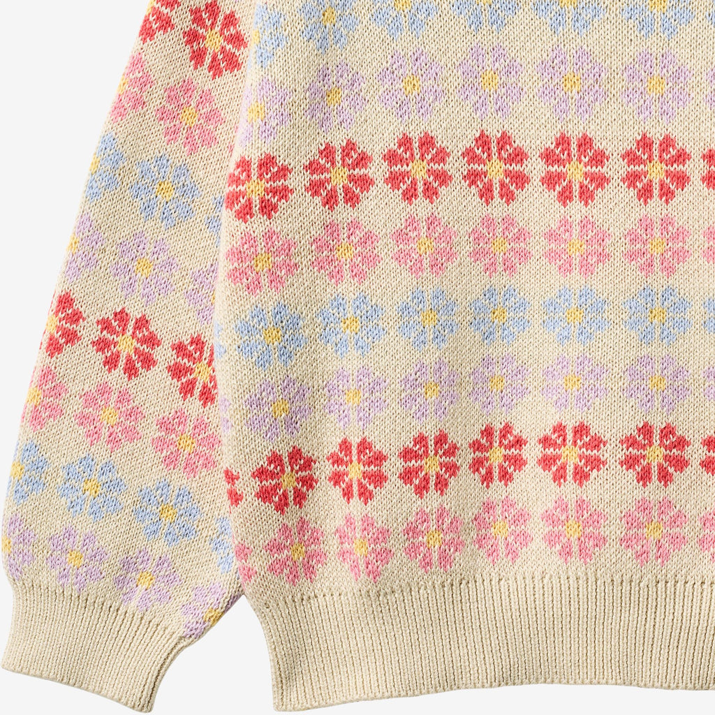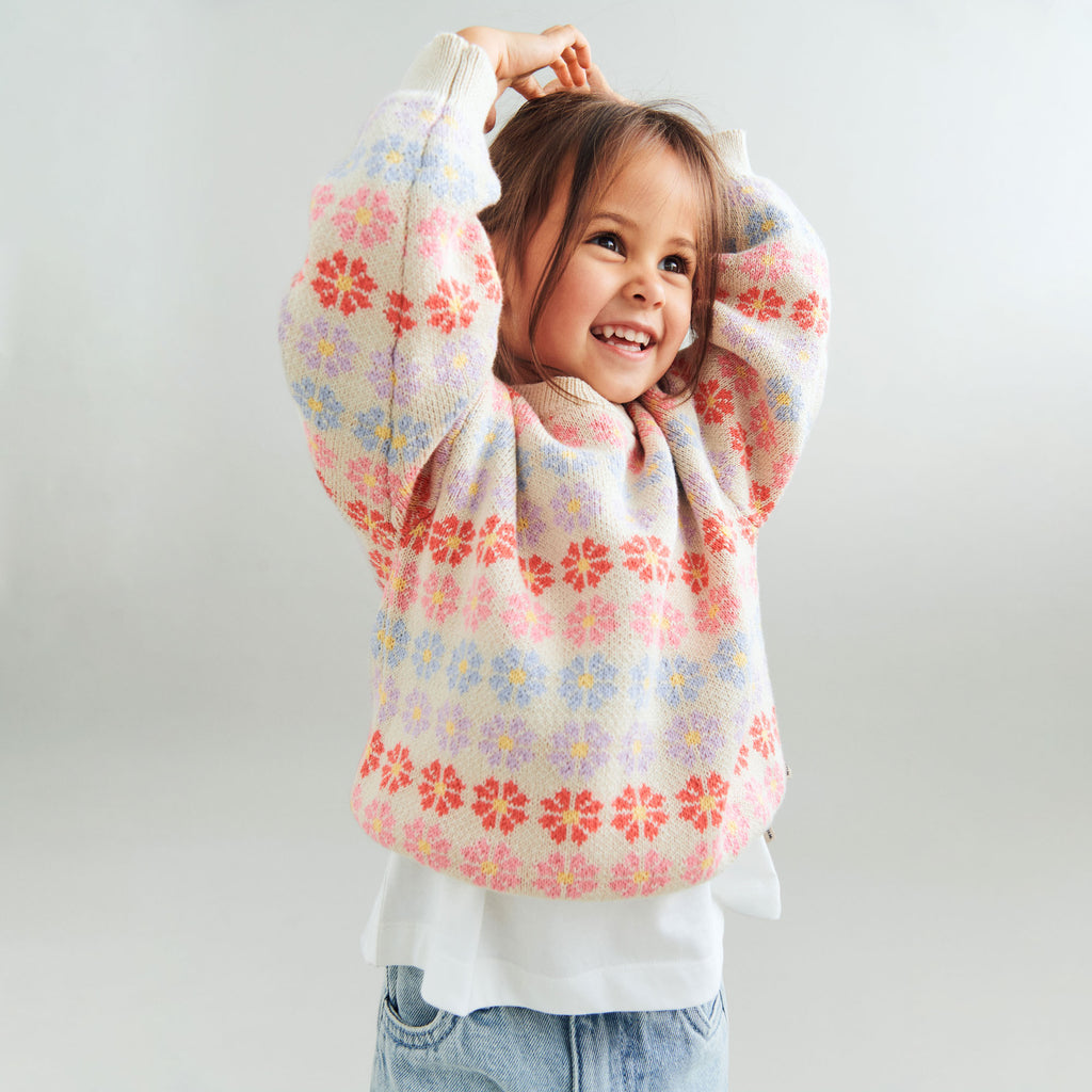Jacquard Pullover Harlow in soft, organic cotton knit for your child.- Crafted from 100% organic cotton knit- Dropped shoulders- Classic pullover design- Unique jacquard knit pattern- Ribbed neckline, hem and cuffs in contrast colourThe Jacquard Pullover Harlow is made from soft, organic cotton knit, ideal for everyday wear during cooler seasons. The relaxed fit allows for comfortable movement, making it suitable for both indoor and outdoor activities.