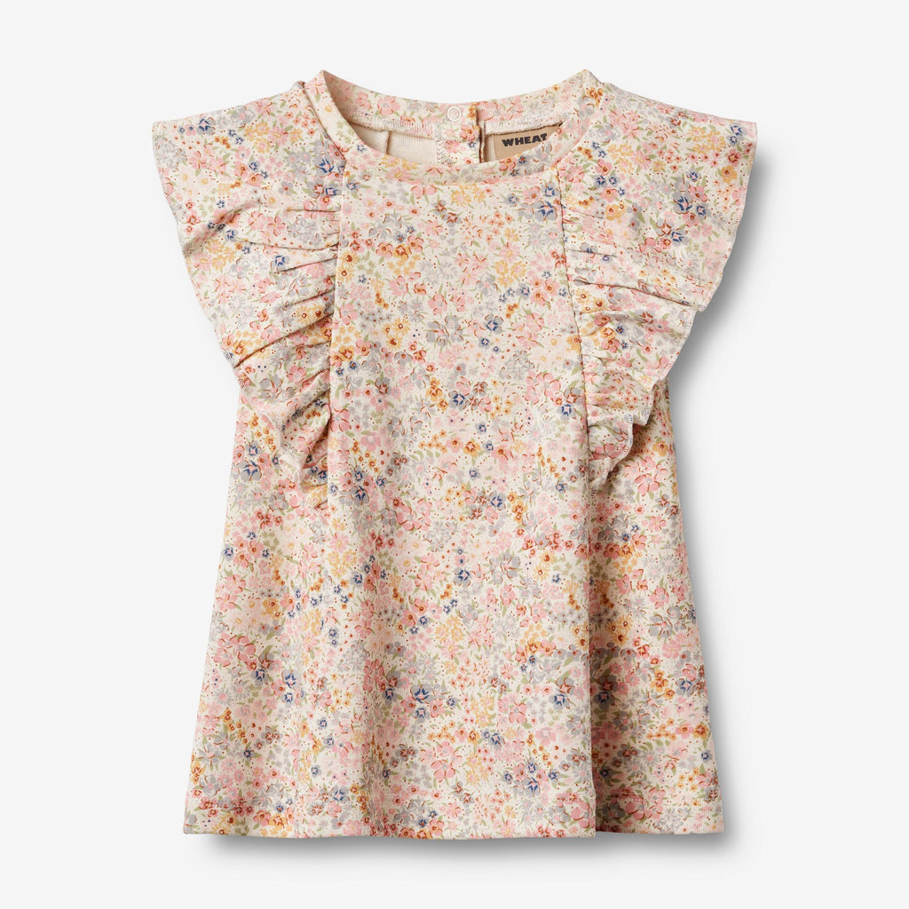 Sleeveless jersey dress with ruffle details in soft organic cotton for babies. - Loose fit- Ruffles at sleeves and down the sides- Wheat signature printWheat's sweet dresses are easy and comfortable for your child to wear and play in. The dress has a flattering cutline with gatherings, which gives the dress some lovely volume. The dress is easy to style with one of our prewalkers to complete the cute summer look or you can add some leggings and a knit on the colder days.