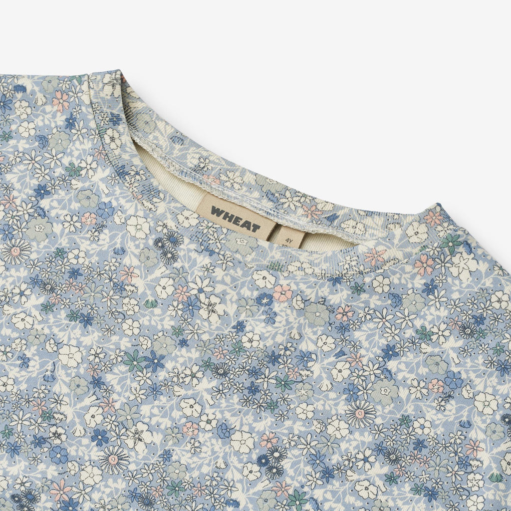 Short-sleeved jersey dress with print in soft organic cotton for children.- Loose fit- Length: above knees- Dropped shoulders- Cutline above the waist with gatherings below- Wheat signature printOur soft jersey dresses have a loose fit, which make them easy and comfortable for your child to wear. The dress has a flattering cutline with gatherings, which gives the dress some lovely volume.