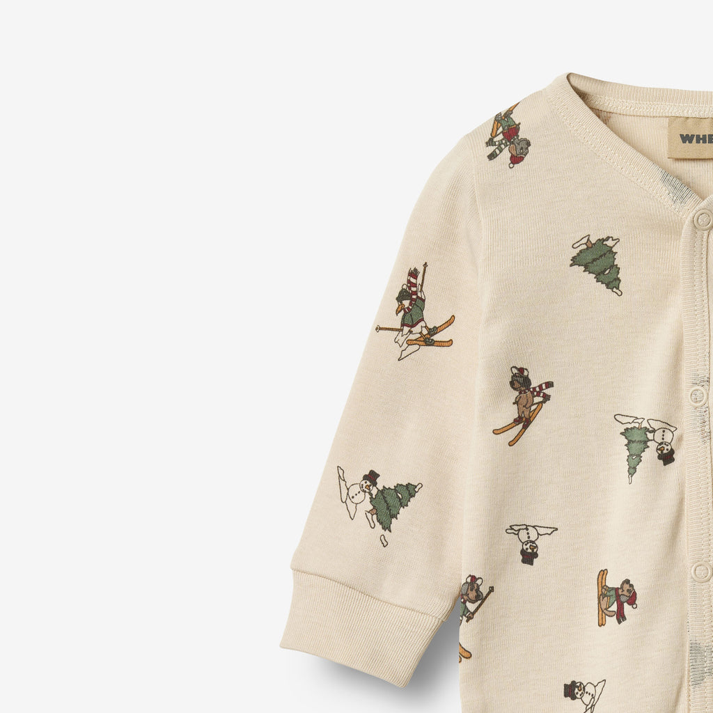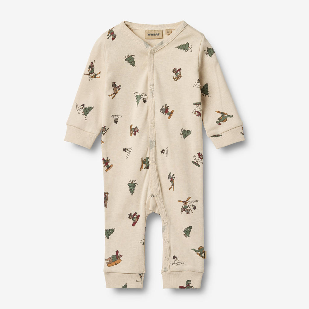 Long-sleeved jumpsuit in soft organic cotton for your baby. - Regular/loose fit- Press buttons down the front and along the inseam- Whreat signature print with Christmas motifsWheat's jumpsuit for babies is both cute and comfortable. The jumpsuit has press buttons at the shoulder or down the front and along the inseam of the legs, which makes it easier for you to dress your baby. The jumpsuit can be worn on its own or as an extra layer underneath everyday clothing.