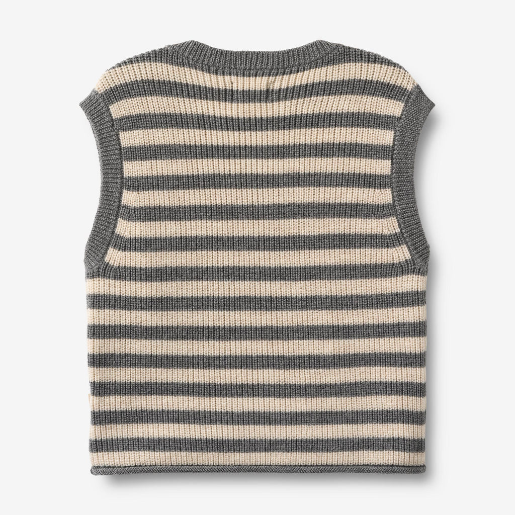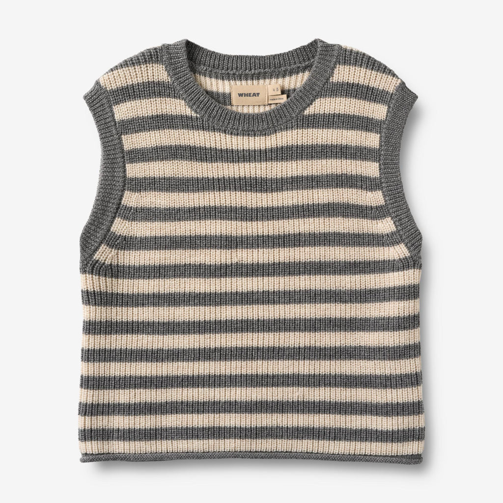 Knit vest with stripes in soft merino wool for children. - Loose fit- Dropped shoulders and large armholes- Rib at the neckline, sleeve openings and bottom hem- StripedWheat's knitwear is a true essential during the cold autumn and winter months, as it is soft and comfortable for your child to wear without any kind of itchiness. Our knits have a classic look with a relaxed fit that make them easy to style with any outfit. The vest is perfect as an extra layer on colder days and works well over a shirt or dress for special occasions.