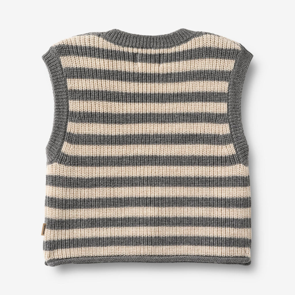 Knit vest with stripes in soft merino wool for your baby. - Loose fit- Dropped shoulders and large armholes- Rib at the neckline, sleeve openings and bottom hem- Buttons at left shoulder for extra comfort- StripedWheat's knitwear is a true essential during the cold autumn and winter months, as it is soft and comfortable for your baby to wear without any kind of itchiness. Our knits have a classic look with a relaxed fit that make them easy to style with any outfit. The vest is perfect as an extra layer on colder days and works well over a body, shirt or dress for special occasions.