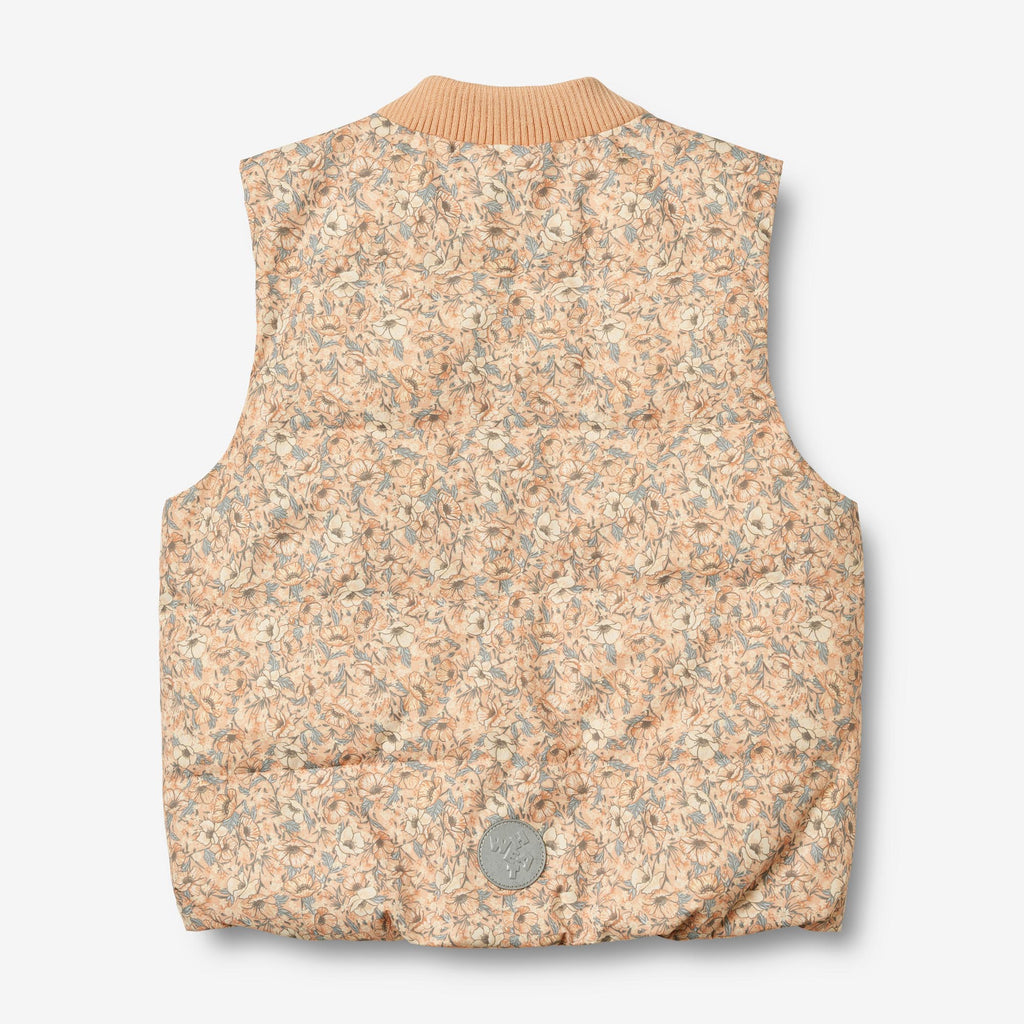 Light puffer waistcoat with print for children. - Rib collar - Welt pockets - Zipper down the front with zip garage- Elasticated bottom hem - Reflective detail at backWheat's puffer waistcoat with technical padding is perfect for the colder days during spring and summer. It is designed with high durability and comfort, as it is water and wind resistant, dirt repellent and easy to clean. The vest has a simple and classic look with practical details such as rib collar, pockets, zipper with zip garage and elasticated bottom hem. The vest is easy to style with a knit or another jacket underneath for a warm and layered look. It is also ideal for summer evenings when your child just needs a lighter extra layer. Please note that the puffer styles do not have taped seams and are therefore not entirely waterproof.