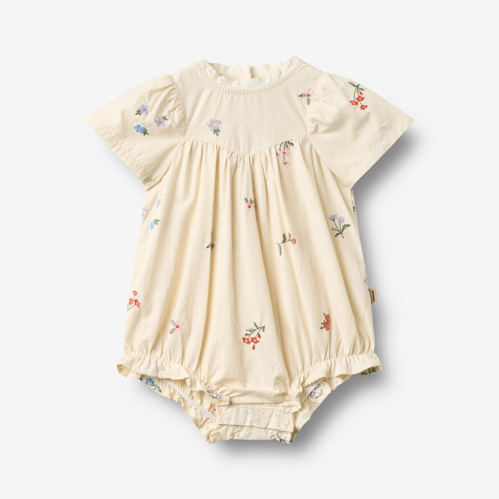 Short-sleeved romper with embroidery in soft woven organic cotton for babies.- Cute cotton lace at neckline- Puffy sleeves- Cutline above the waist with gatherings below- Elasticated sleeve and bottom hem- Gatherings at shoulder and loose fit sleeves- Button closure at the back and press buttons at the crotch- Woven embroidery flowersThese soft and breathable summer rompers are a charming essential for your baby’s warm-weather wardrobe. Designed with comfort in mind, they feature a relaxed fit that allows for easy movement and play. The lightweight woven fabric keeps your baby cool on sunny days, while the practical snap buttons ensure easy dressing and changing.