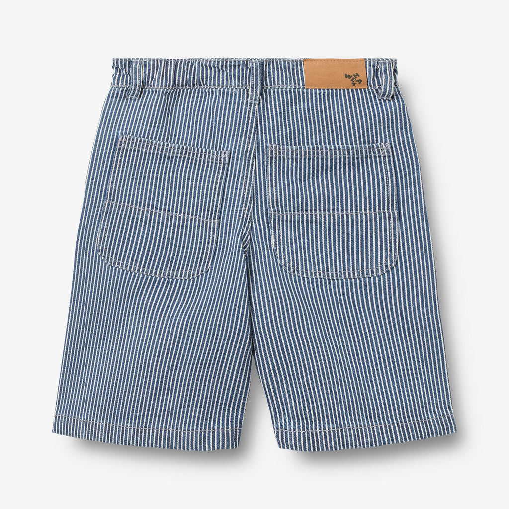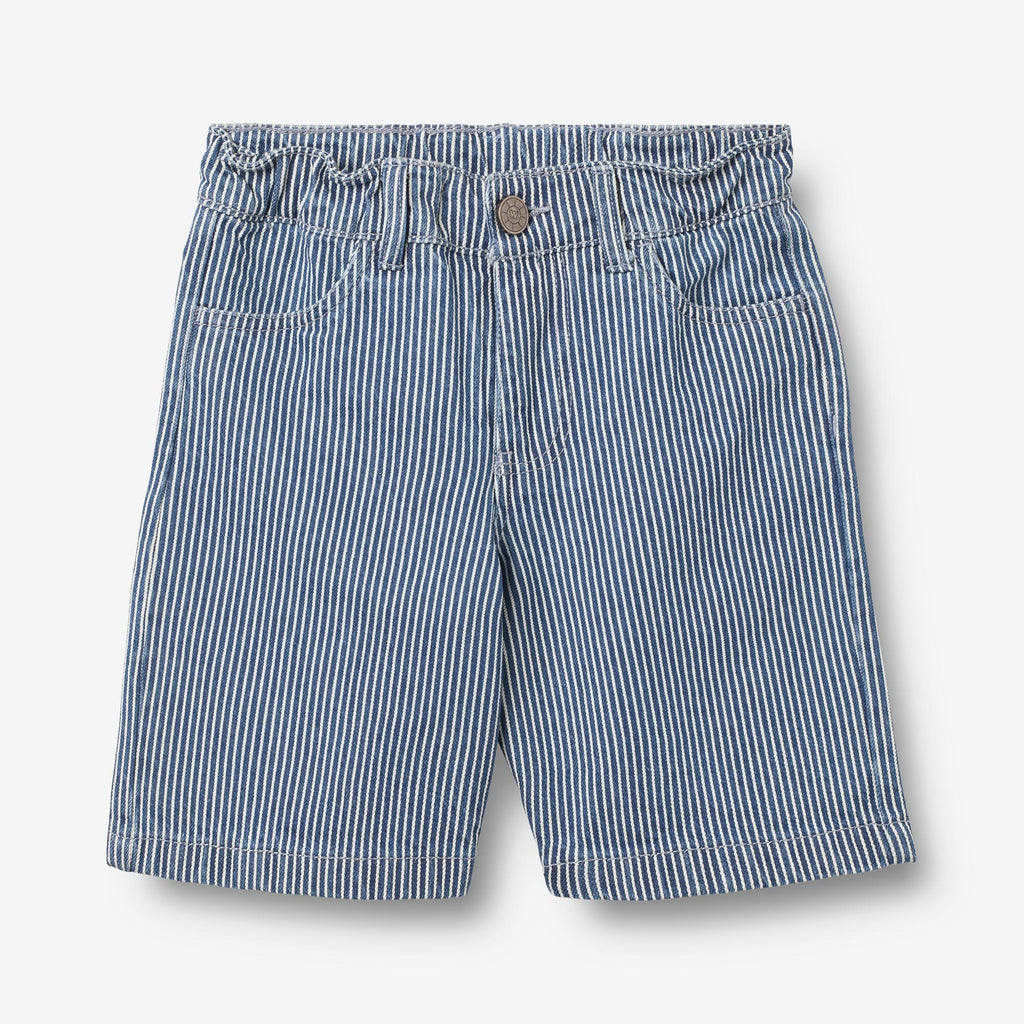 Comfy striped shorts in heavy denim for children. - Regular/loose fit- Side pockets- Adjustable elastic inside waistband- Fly with zipper and a metal screw button- Sideseam moved slightly forward - Belt loops- Patch pockets with cutline at the back- Patch label - Striped denimCool denim shorts are an essential part of your child’s daily wear with a practical elastic at the waist and pockets. The shorts have a loose and relaxed fit around the legs, which make the shorts comfortable for your child to wear and can easily be styled with one of our T-shirts, tops or knits for everyday life.