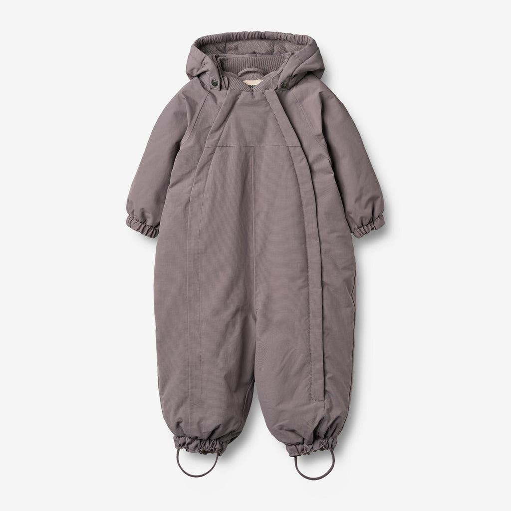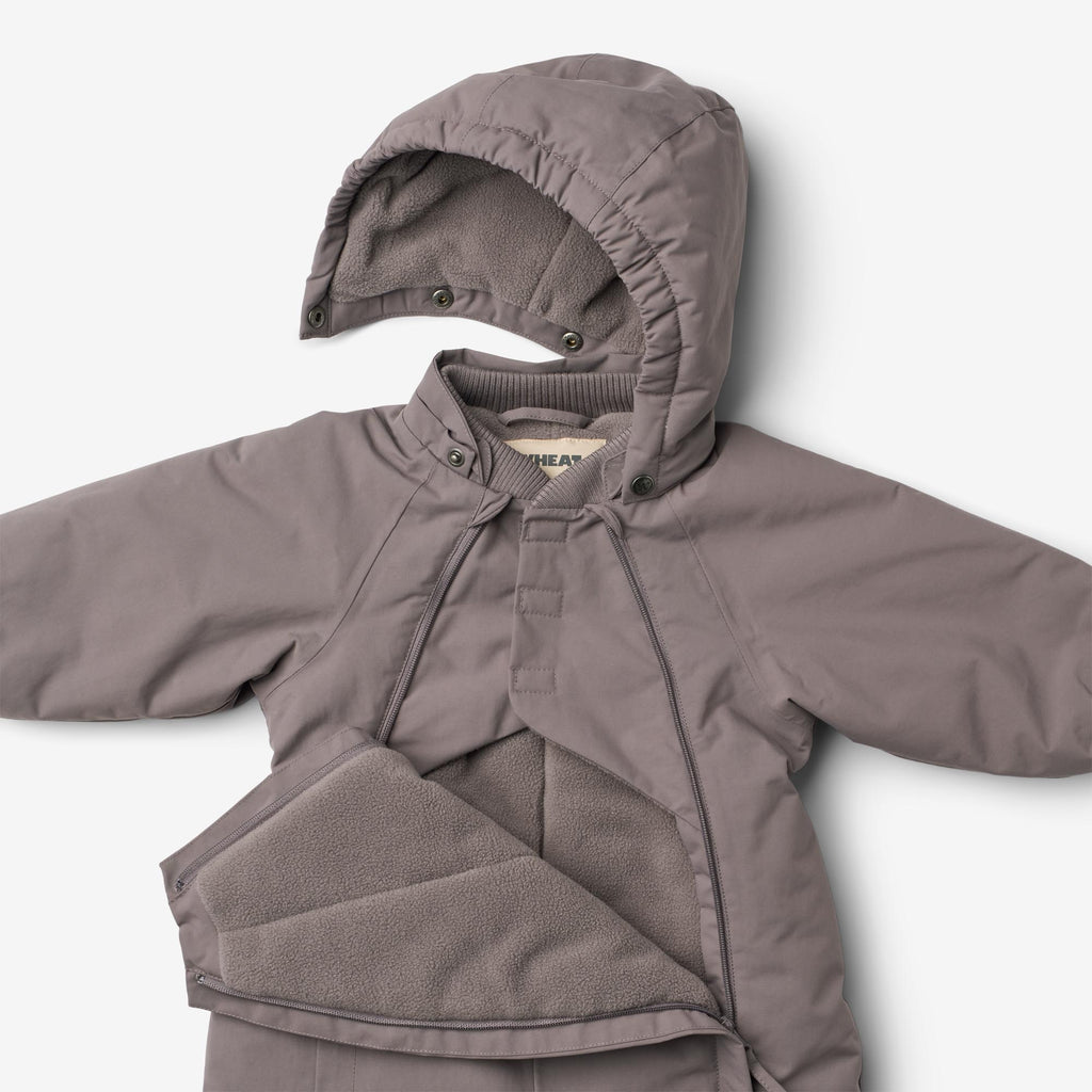 Technical snowsuit with waterproof and breathable construction in recycled materials for your child.- Detachable hood with metal press button attachment- Soft rib at the collar- SAB Coil zipper down the front- Elastic rubber tape at the bottom hem- Wheat rubber strap at the leg opening- Reflective logo badge and printWheat's Snowsuit Adi is crafted from a waterproof and breathable recycled nylon, making it ideal for cold autumn and winter days. The snowsuit is designed for comfort and functionality, allowing your child to move freely during outdoor activities.The snowsuit features a soft, recycled fleece lining for added warmth and a detachable hood for versatile weather protection. The elasticated cuffs and rubber straps at the leg openings ensure a snug fit, while the reflective details enhance visibility.
