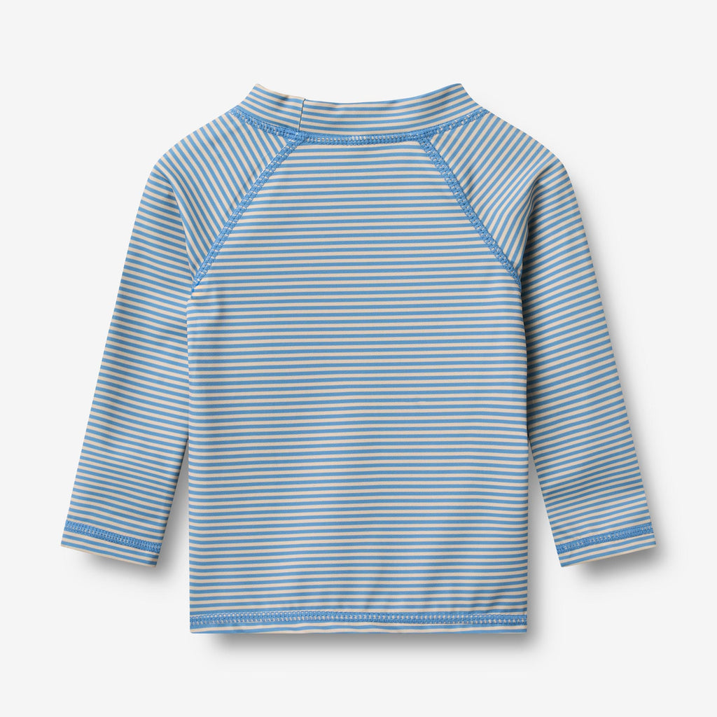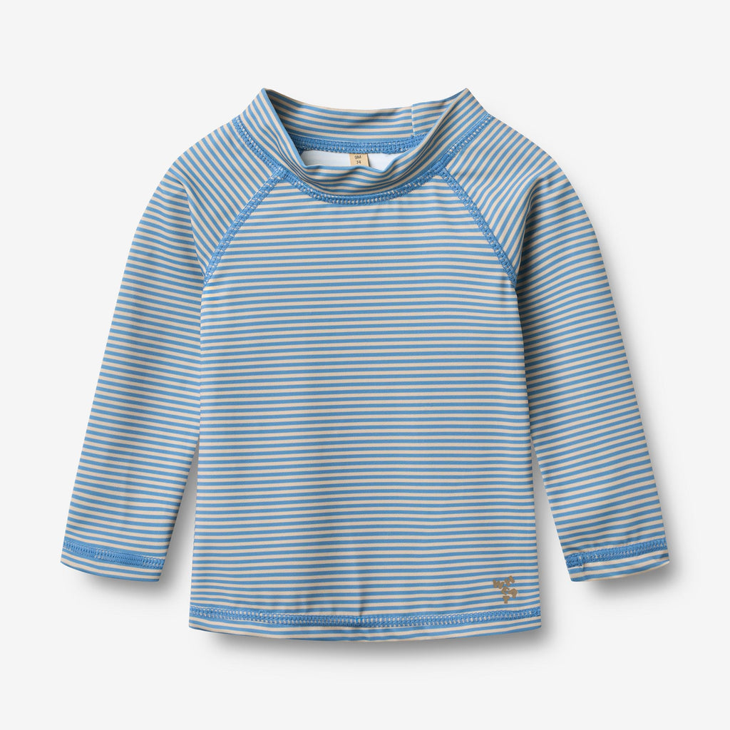 Unisex long-sleeved swimming T-shirt with print for babies.- Slim fit- Small folded collar- Long sleeves- Raglan sleeves- Signature printThe swim T-shirt has a small collar to protect the neck from the sun and raglan sleeves. The style is with UV 40+/UPF 40+ protection. The T-shirt can easily be mix and matched with our swimming shorts for a cool look. How to take care of your swimwear- Always wash your swimwear after it's been in chlorine or salt water- Follow the care label