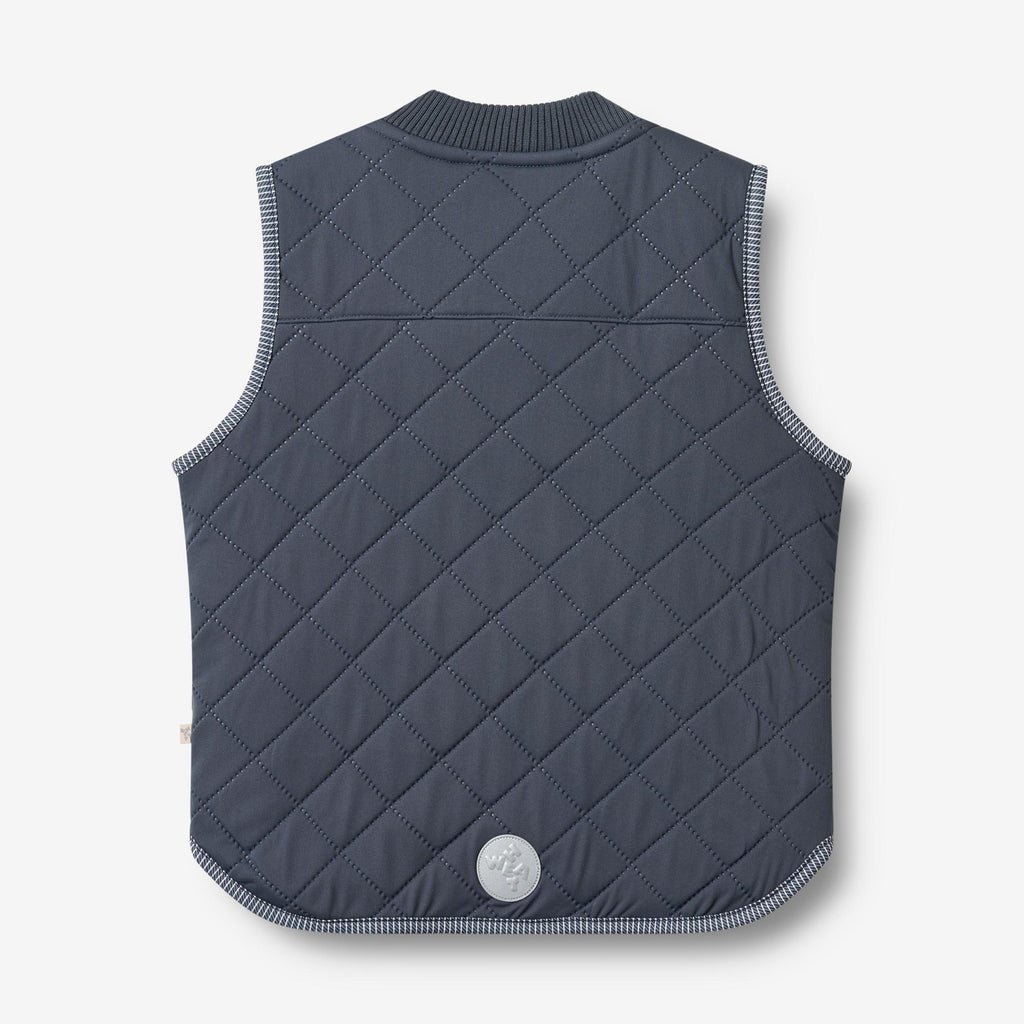 Our cozy pile-lined thermo vest for children. - Regular fit- Fully lined with pile- Rib collar- Shoulders moved forward at front- Cutline at back- Kangaroo pockets- Zipper with chin guard at placket- Reflective badge at back- Edgebands with contrast printWheat's popular thermo wear for children is a true everyday favourite, as the soft and lightweight material makes it comfortable to move and play in. The thermo vest is produced in 100% recycled polyester and can be used as a cozy layer indoor and as practical transitional outerwear. It is not waterproof but is water repellent and is suitable for the damp autumn weather.Wheat's thermo vest can easily be styled with a knit or another jacket underneath to create a cool layered look.