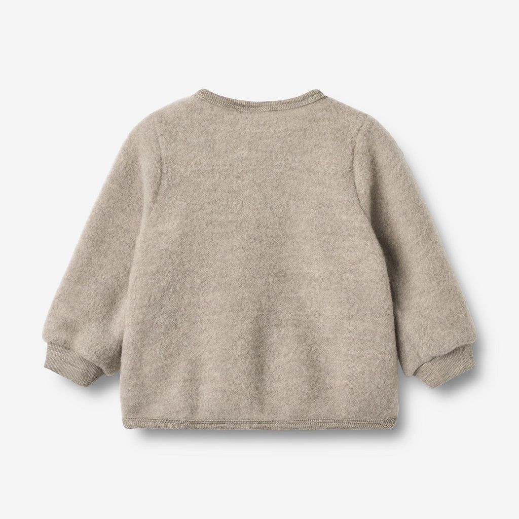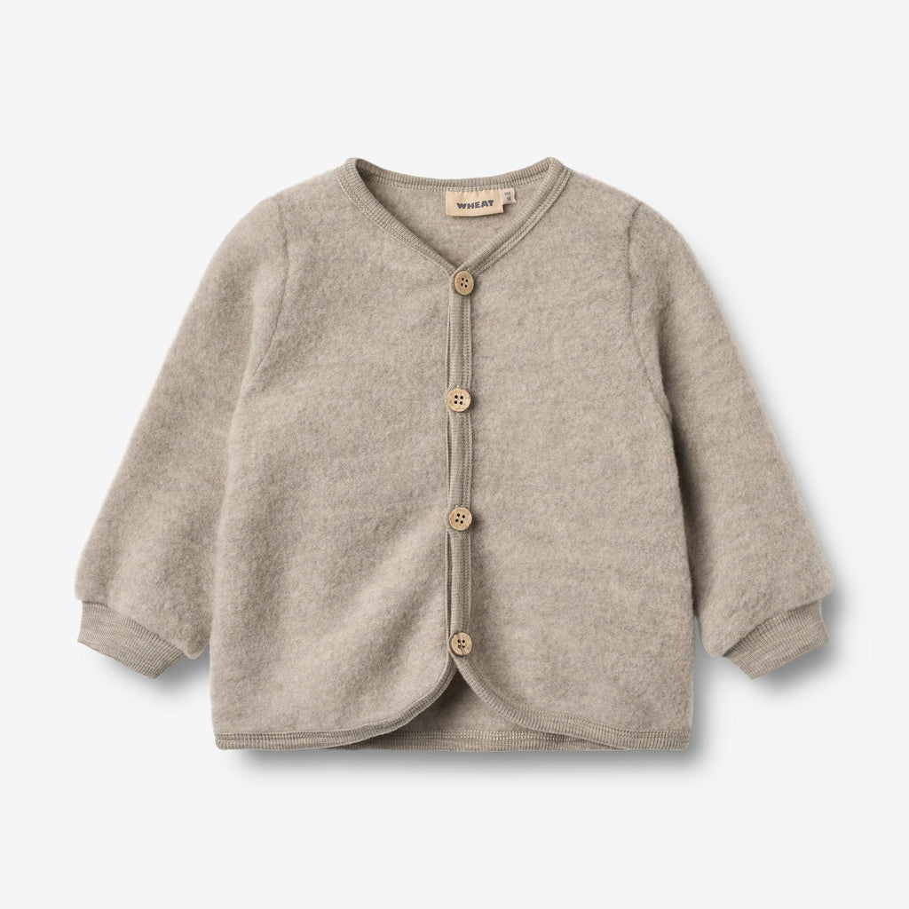 Long-sleeved wool cardigan in felted merino wool for your baby. - Regular fit- Buttons down the front- Rib cuffs- Soft edge band at the neckline and bottom hem Wheat’s wool wear is specially designed to keep your child warm in the cold weather, while still keeping them from overheating, as wool has the unique quality that it helps regulate body temperature. The wool styles are great for layering and soft on bare skin.Wheat’s cardigans have a classic look with buttons down the front. The soft cardigan is comfortable to wear and a great addition to your child's autumn and winter wardrobe. It can be styled on its own as a light jacket with a T-shirt underneath and gives the outfit a cute look. It is also perfect as an extra layer underneath a jacket.